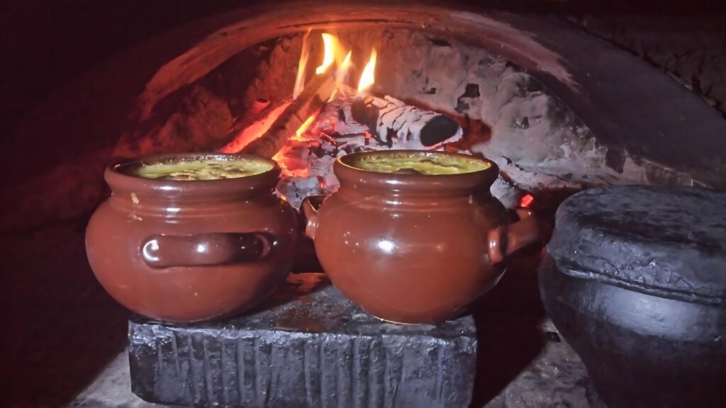 Финальный аккорд —еда из настоящей белорусской печи, которой больше 70 лет. Здесь вкус — не декорация, а характер места: золотистая бабка с хрустящей корочкой и нежной серединой, телятина на рёбрышках томлёная в печи, уха, щи из квашеной капусты, каша в чугуне, рыба на ольхе в печи, к ним — соленья, моченья, квас, травяной чай с мёдом. Вкусные блюда, приготовленные по старинным Белорусским рецептам.